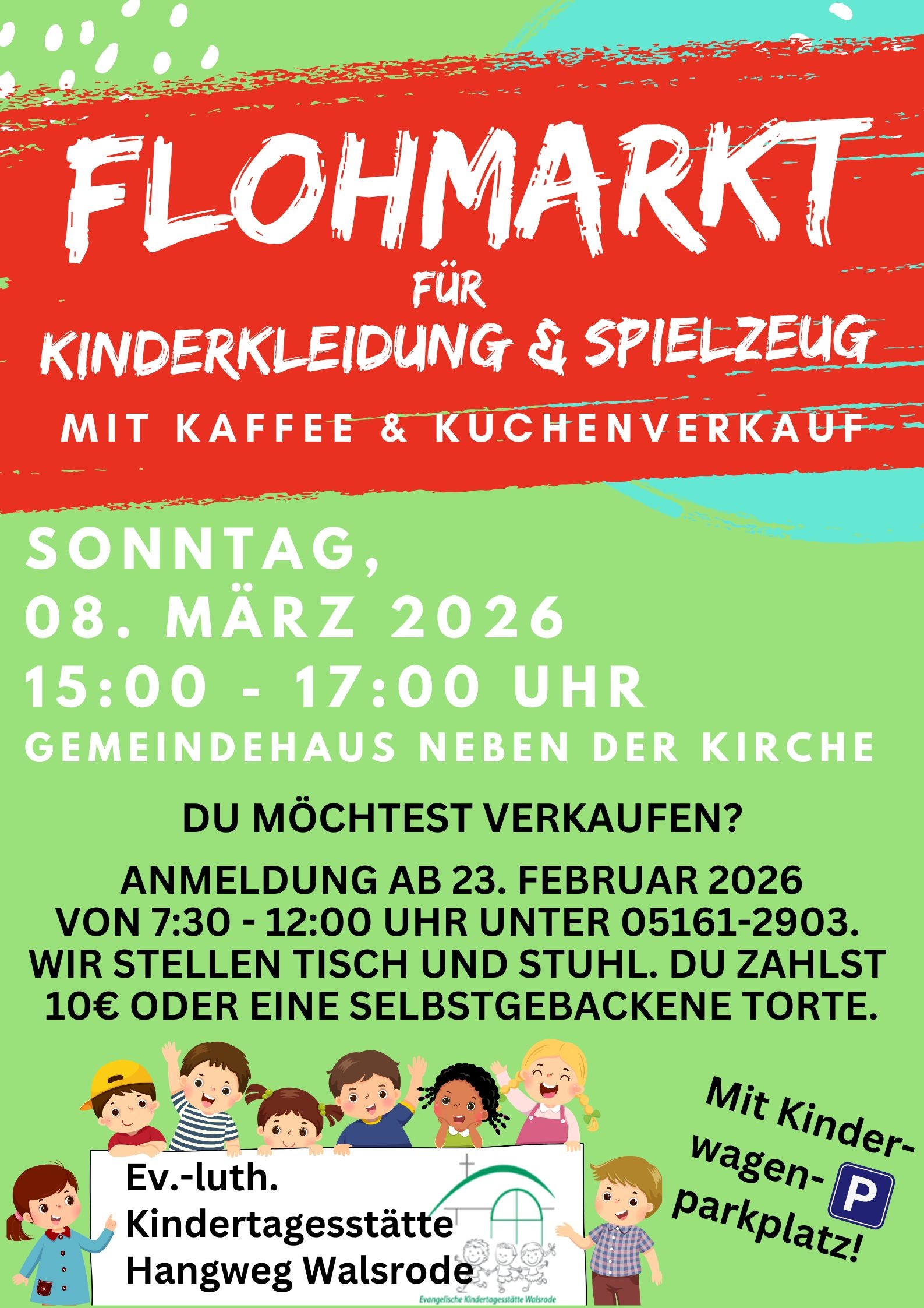 Am Sonntag, den 08. März 2026 findet von 15:00 bis 17:00 Uhr wieder der Flohmarkt für Kinderkleidung und Spielzeug im Gemeindehaus Walsrode statt. Verkauft und gekauft werden können gut erhaltene Kinderkleidung, Babyausstattung, Bücher, Fahrzeuge und Kinderspielzeug. Interessierte Verkäuferinnen, können sich ab 23. Februar 2026 jeweils vormittags von 7:30-12:00 Uhr unter 05161-2903 anmelden. Die Kirchengemeinde stellt einen Tisch und Stühle zur Verfügung. Außerdem gibt es Platz für einen Kleiderständer. Die Standgebühr beträgt 10€ oder eine selbstgebackene Torte. Die Torten werden an dem Nachmittag im Flohmarkt-Café angeboten und können auch zum Verzehr außerhalb des Gemeindehauses gekauft werden. Initiatorin des Flohmarktes ist das Team der Kindertagesstätte Hangweg rund um die Leiterin Svenja Frank. Weitere helfende Hände sind herzlich willkommen.